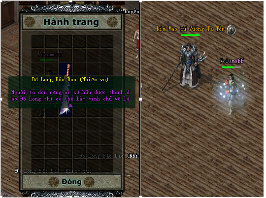 Đồ Long Đao được giữ bởi “Kim Mao Sư Vương Tạ Tốn“, ông ta sẽ xuất hiện cùng với Thủy Tặc Đầu Lĩnh. Nếu ai đánh bại được ông ta sẽ nhặt được “Bảo Đao Đồ Long (nhiệm vụ). Giao bảo đao này cho NPC “Thuyền Trưởng” trên thuyền để nhận phần thưởng nhiệm vụ. Phần thưởng là 10 Tiền Đồng + 2 Bảo Rương Thủy Tặc. Đồng thời khi khi nạp nhiệm vụ cũng sẽ khiến thuyền cập bến ngay lập tức. Vì vậy tất cả người chơi đi cùng chuyến cũng sẽ cập bến bờ Bắc Phong Lăng Độ.